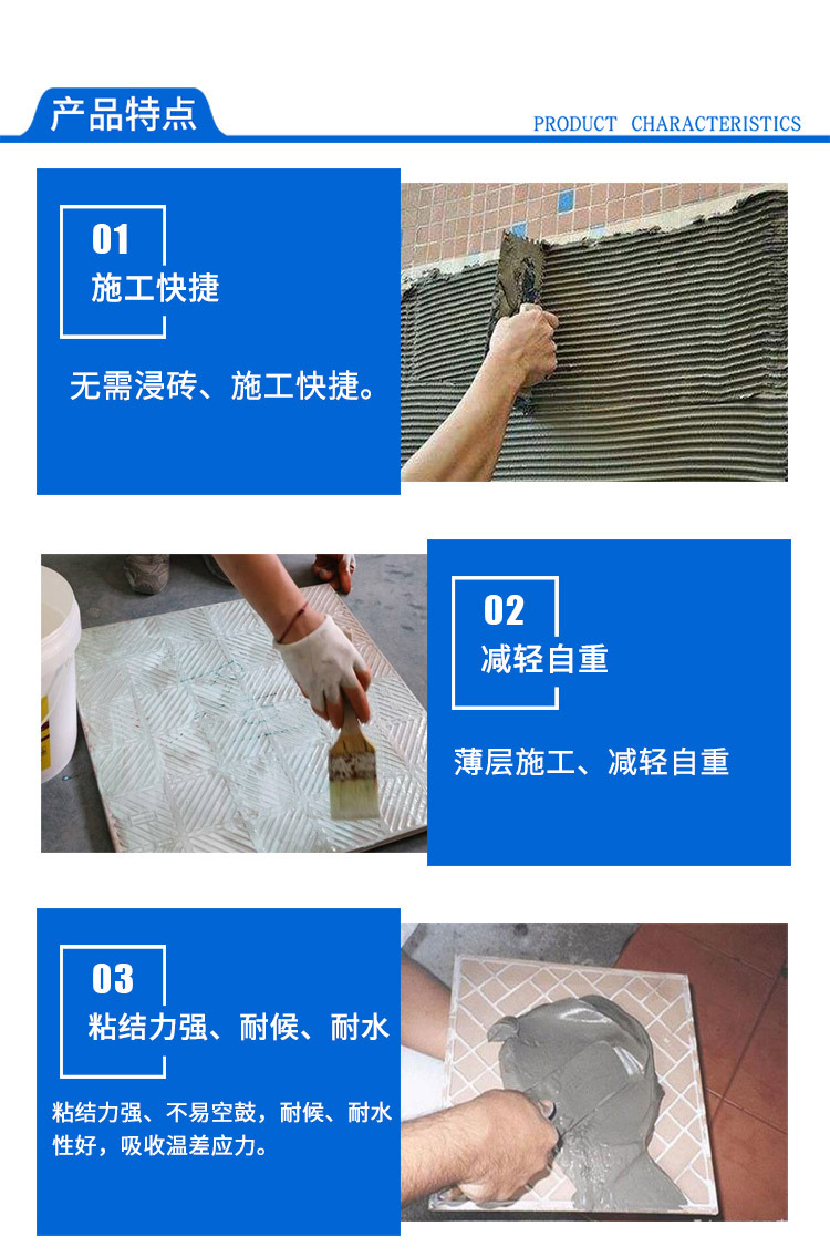 施工中不用浸磚濕墻、良好的柔韌性、抗滲、抗裂、抗老化性佳,耐高溫、耐凍融、無毒環保,施工簡便。